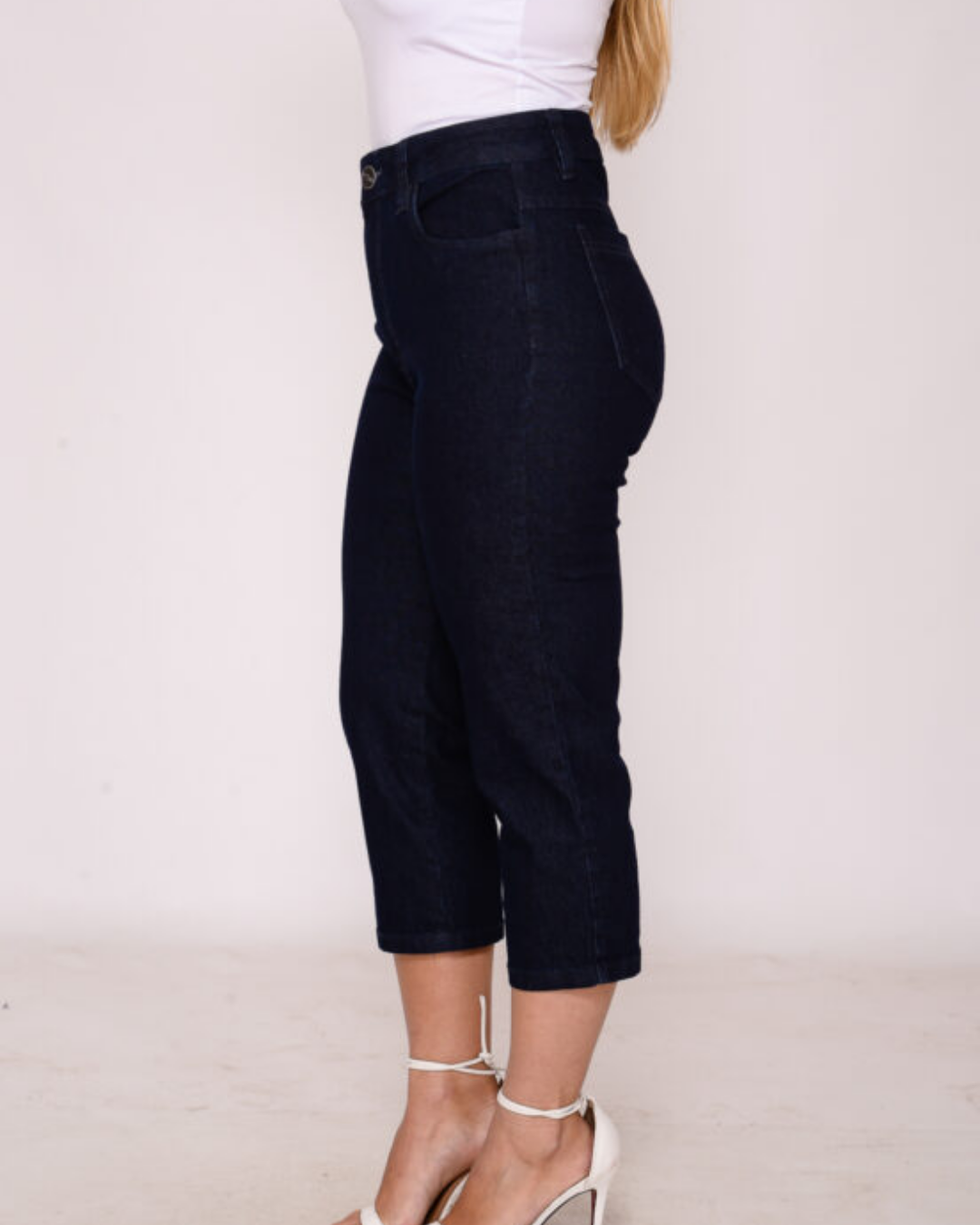 Sua modelagem capri valoriza a silhueta e proporciona um caimento confortável, permitindo liberdade de movimentos ao longo do dia. A lavagem azul clássica traz um toque atemporal, facilitando combinações com diferentes peças e estilos.
